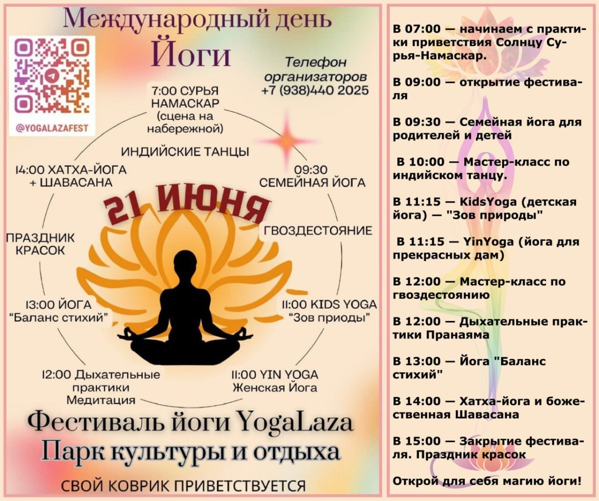 Оптимистка Опубликовано 19 июня, 2024 Опубликовано 19 июня, 2024 (изменено) Фестиваль Йоги 21 июня в Лазаревском пройдет фестиваль ЙОГИ — YogaLazaFest! Для всех, кто давно хотел, но боялся прикоснуться к йоге! Присоединяйтесь к нам в Международный день Йоги! Не пропусти уникальную возможность перезагрузиться и вдохновиться на празднике тела и души! 🔥 ❤🔥 В 07:00 — начинаем с практики приветствия Солнцу Сурья-Намаскар. 📌 Площадь перед сценой на против "Колеса обозрения" ❤🔥 В 09:00 — открытие фестиваля, знакомство с инструкторами и конечно же яркий зажигательный индийский танец, от Студии индийского танца "Рангила" под руководством — Алеси Кардановой. 📌 Зелёная поляна у входа в Парк Культуры и отдыха ❤🔥 В 09:30 — Семейная йога для родителей и детей от Екатерины Зета. 📌 Зелёная поляна у входа в Парк Культуры и отдыха ❤🔥 В 10:00 — Мастер-класс по индийском танцу. А также Алеся научит вас правильно носить сари. ‼ Далее на разных площадках будут проходить разные практики, одни для деток, другие для родителей. ‼ ❤🔥 В 11:15 — KidsYoga (детская йога) — "Зов природы" с Анжеликой Евгеновой — Студия "РАДА". 📌 Зелёная поляна у входа в Парк Культуры и отдыха ❤🔥 В 11:15 — YinYoga (йога для прекрасных дам) с Екатериной Зета. 📌 Lounge зона Парка (деревянная площадка около пруда с черепахами) ❤🔥 В 12:00 — Мастер-класс по гвоздестоянию и дыхательные практики с Ильёй Чкан. 📌 Зелёная поляна у входа в Парк Культуры и отдыха ❤🔥 В 12:00 — Дыхательные практики. Пранаяма. Медитация с Анжеликой Евгеновой. 📌 Lounge зона Парка (деревянная площадка около пруда с черепахами) ❤🔥 В 13:00 — Йога "Баланс стихий" с Анжеликой Ковтун 📌 Lounge зона Парка (деревянная площадка около пруда с черепахами) ❤🔥 В 14:00 — Хатха-йога и божественная Шавасана с Еленой Зиминой. По секрету скажем, что Шавасана - это кульминация любой практики Йоги. 📌 Lounge зона Парка (деревянная площадка около пруда с черепахами) ❤🔥 В 15:00 — Закрытие фестиваля. Праздник красок 📌 Зелёная поляна у входа в Парк Культуры и отдыха Открой для себя магию йоги! Изменено 19 июня, 2024 пользователем Оптимистка 6 4 "Если море тебя печалит, ты безнадёжен" Федерико Гарсиа Лорка
