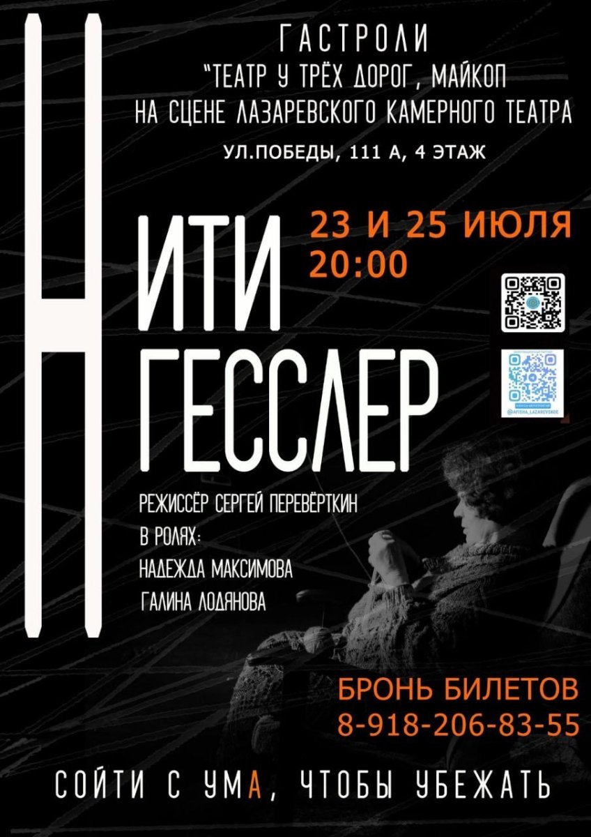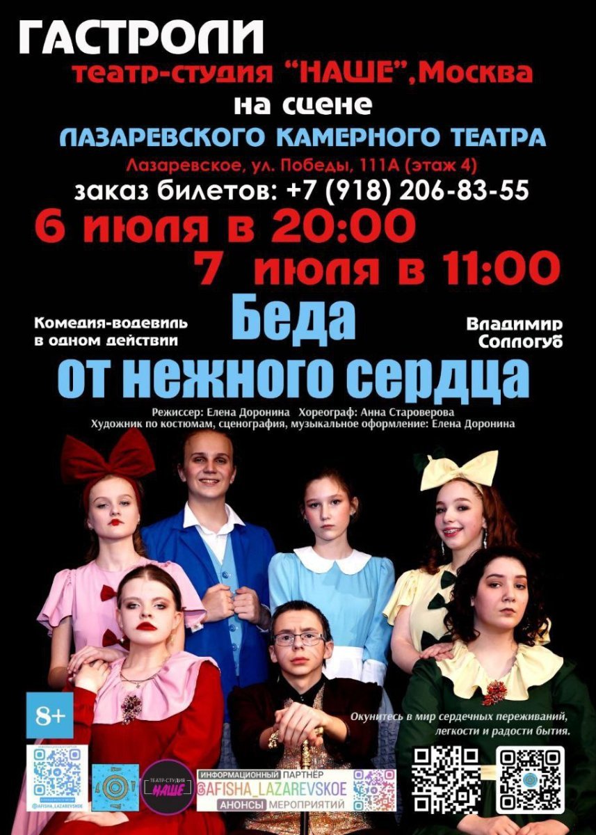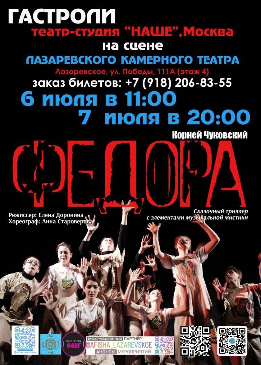 Оптимистка Опубликовано 3 июля, 2024 Опубликовано 3 июля, 2024 Спектакль для всей семьи в Камерном театре. Стоимость 500 ₽ По мотивам произведений Корнея Чуковского. Это фантастический музыкальный трейллер с заколдованной сказкой и мистическими сценами. Спектакль - Лауреат международных фестивалей молодежных студийных театров Заказ билетов в ватцапе 89182068355 9 4 "Если море тебя печалит, ты безнадёжен" Федерико Гарсиа Лорка