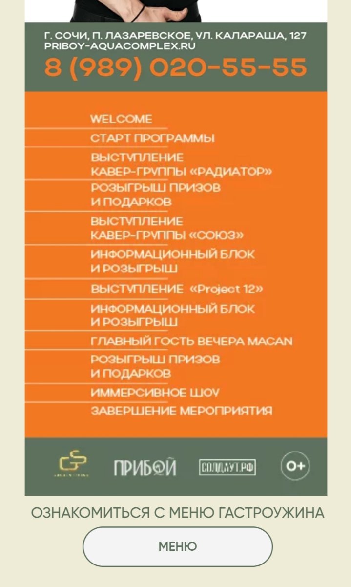 Оптимистка Опубликовано 6 июля, 2024 Опубликовано 6 июля, 2024 4 часа назад, Оптимистка сказал: Самое волнующее событие этого лета — торжественное открытие аквакомплекса «Прибой» в п. Лазаревское (Сочи) ⠀ 13 ИЮЛЯ вас ждет море впечатлений: Звездный гость — MACAN, выступление кавер-групп: 🔹«Союз» 🔹«Радиатор» 🔹«Projeck 12» ⠀ Розыгрыш призов, танцевальные шоу, гастроужин. - Сбор гостей: 18:00 - Начало мероприятия: 19:00 Дополню... Стоимость можно узнать только по номеру телефона или оставив заявку на сайте Прибоя 4 3 1 "Если море тебя печалит, ты безнадёжен" Федерико Гарсиа Лорка