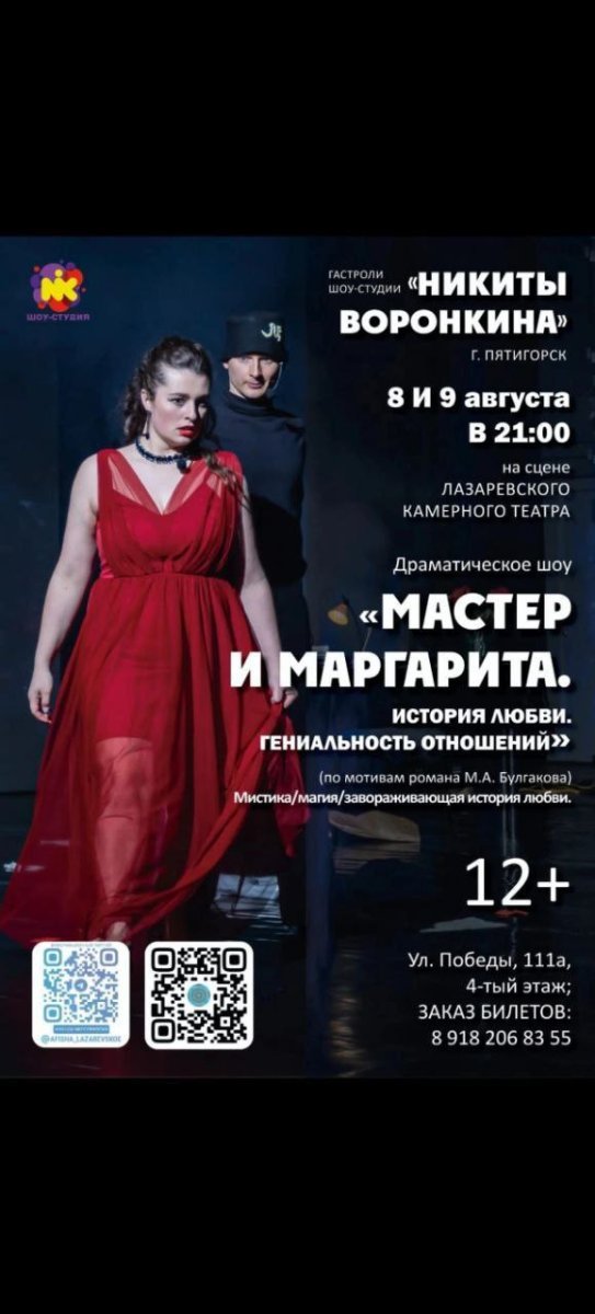 Оптимистка Опубликовано 30 июля, 2024 Опубликовано 30 июля, 2024 "НЕСПЕКТАКЛЬ - ШОУ МАСТЕР И МАРГАРИТА: ИСТОРИЯ ЛЮБВИ. ГЕНИАЛЬНОСТЬ ОТНОШЕНИЙ" с элементами сценической магии, лазерными спецэффектами, завораживающая история любви, глубокая энергетика и пикантный юмор. В Камерном театре. Стоимость 1200₽ 8августа в 21:00 9августа в 21:00 2 1 "Если море тебя печалит, ты безнадёжен" Федерико Гарсиа Лорка