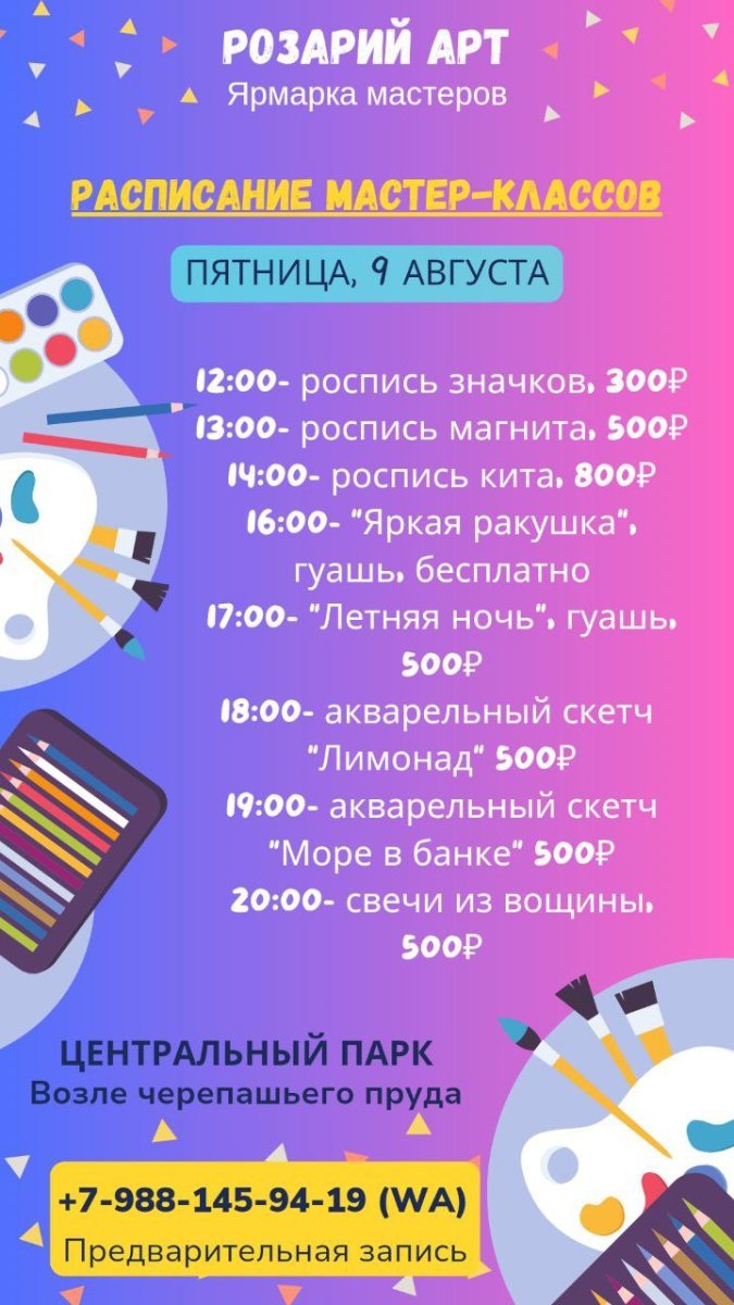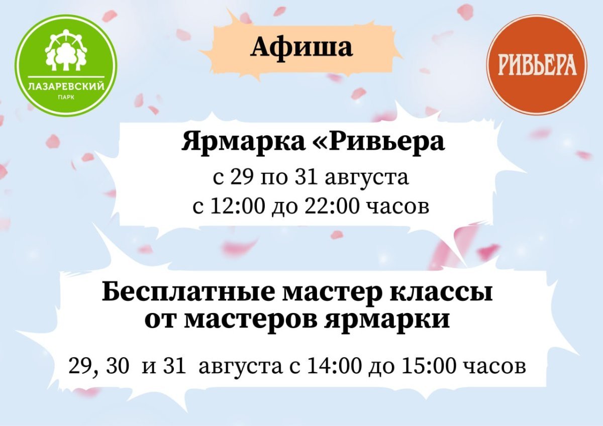 Оптимистка Опубликовано 28 августа, 2024 Опубликовано 28 августа, 2024 Ярмарка "Ривьера Арт" в парке! 🗓 С 29 по 31 августа с 12:00 до 22:00 на территории парка будет проходить ярмарка "Ривьера Арт". Вас ждут уникальные изделия ручной работы и бесплатные мастер-классы! ❗️Расписание бесплатных мастер-классов:❗️ 🗓 29 августа, четверг: ⏰ 14:00-15:00 — мастер-класс «Маяк на острове» (дрифтвуд) 🗓 30 августа, пятница: ⏰ 14:00-15:00 — мастер-класс «Чехол для телефона из фетра» 🗓 31 августа, суббота: ⏰ 14:00-15:00 — мастер-класс «Куколка с косой» (скрутка) 4 3 "Если море тебя печалит, ты безнадёжен" Федерико Гарсиа Лорка