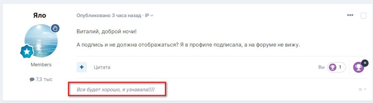 А подпись и не должна отображаться? Я в профиле подписала, а на форуме не вижу.