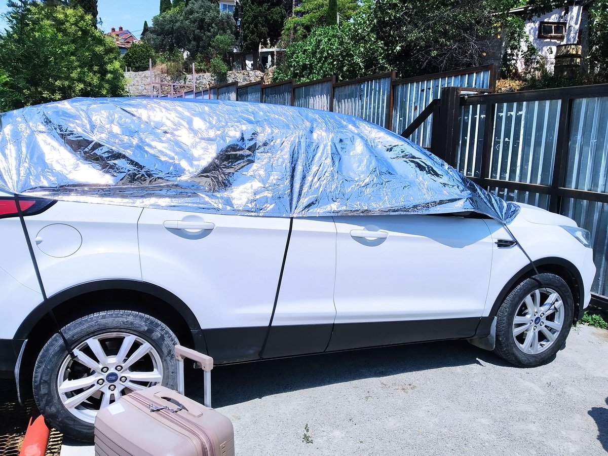 К этой, крайней, поездке, жена приобрела "защиту от солнца" салона машинки... С одной стороны, как видно на фото, фольгированность, изнутри - что-то типа какой-то ткани. Крепится растягивающимися шнурами с пластиковыми крюками, которые, как видно можно цеплять за всё, за что можно зацепить. Во всяком случае изделие закрывает все окна и крышу....от южного, любопытного и горячего, солнца... Места, при сворачивании, занимает мало.