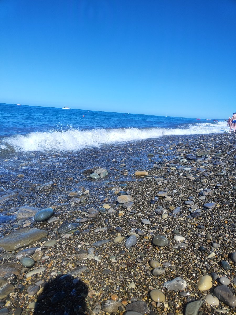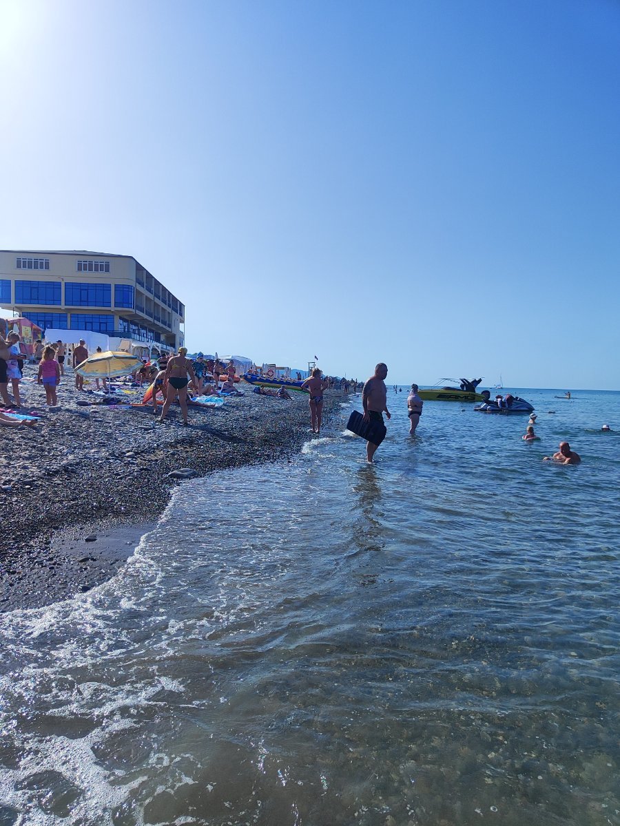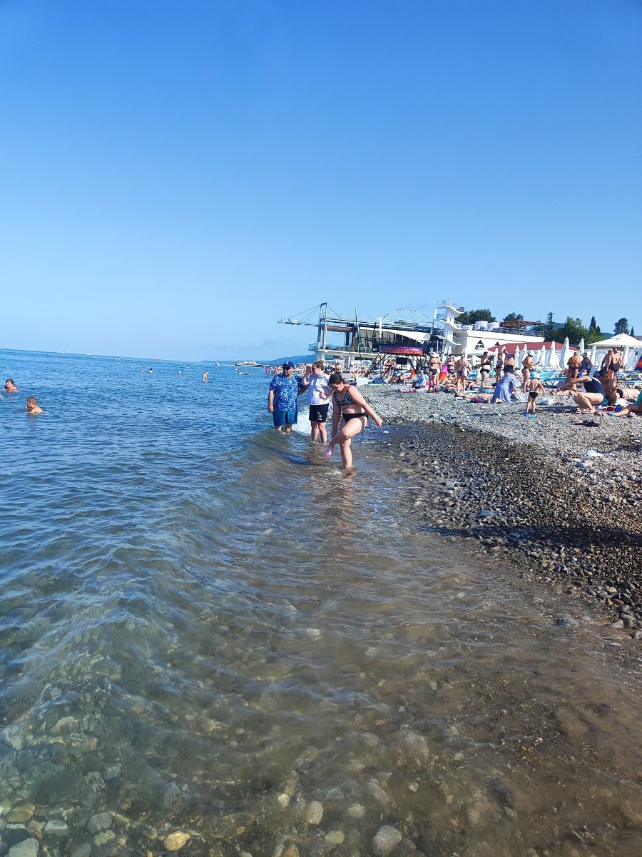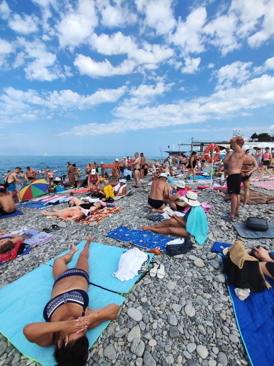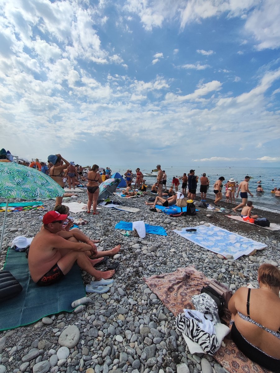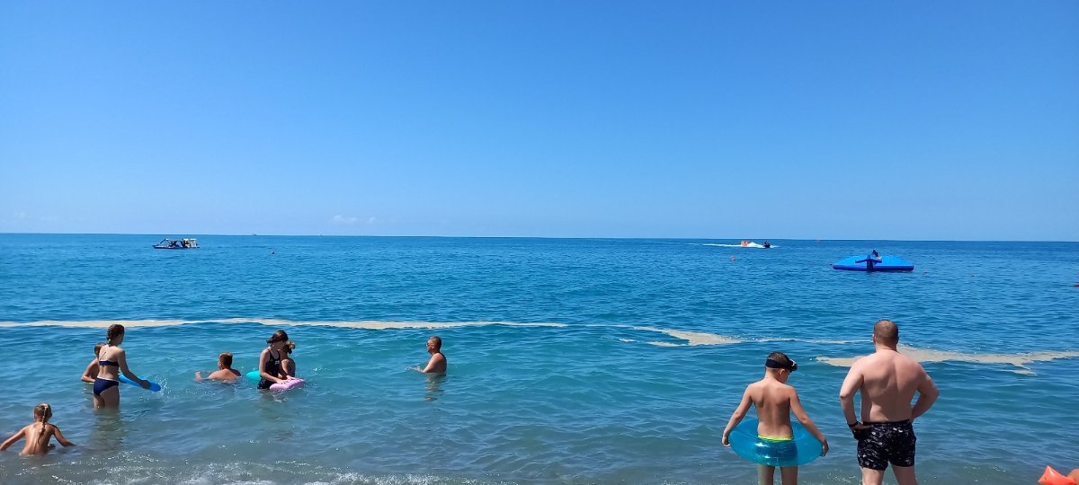 В 10 утра еле нашли место для зонта и полотенца :ai: - прошли от Морской звезды вправо. В итоге остановились на пляже сан.Бирюза. Сначала море было грязное, с какой-то желтоватой пеной.