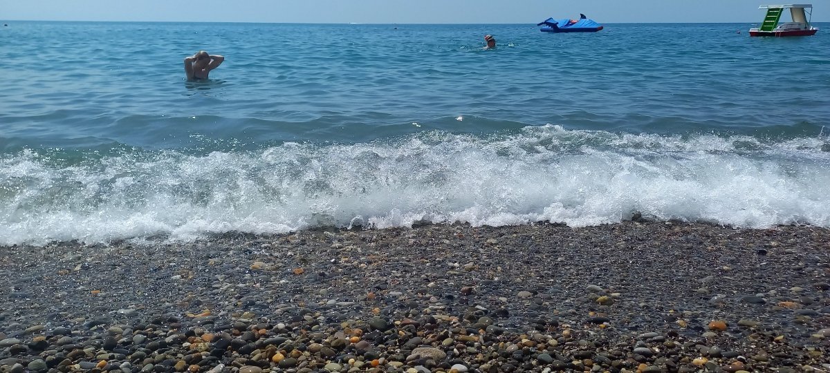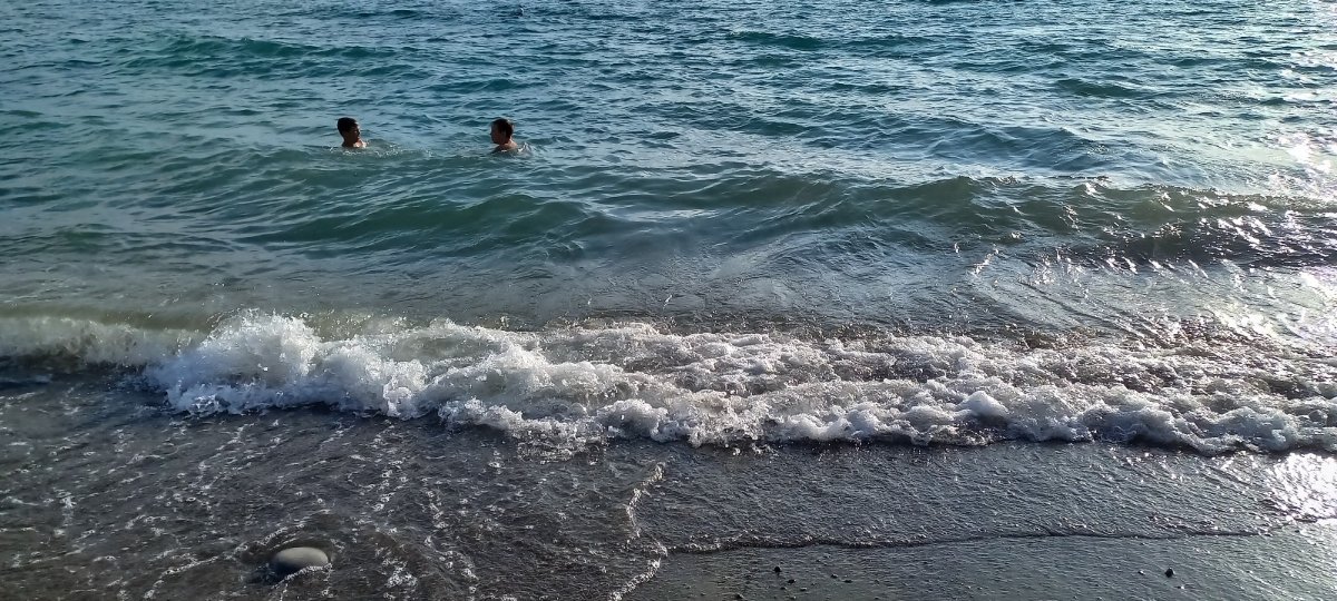 Сегодня не купались, волнение достаточно сильное. Причём периодически кажется, что море успокаивается, и потом вдруг одна за одной очень сильные волны.