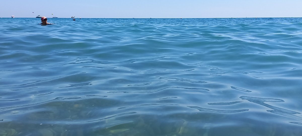 Вода сегодня отличная, тёплая! Была поначалу грязноватая, в прибрежной зоне (а я плаваю именно вдоль берега, потому что пловец из меня ещё тот...) и водоросли, и насекомые, и толпы медуз, и, увы, пакеты и кусочки тряпок :bh: Сечас уже чистая