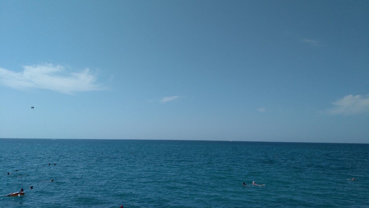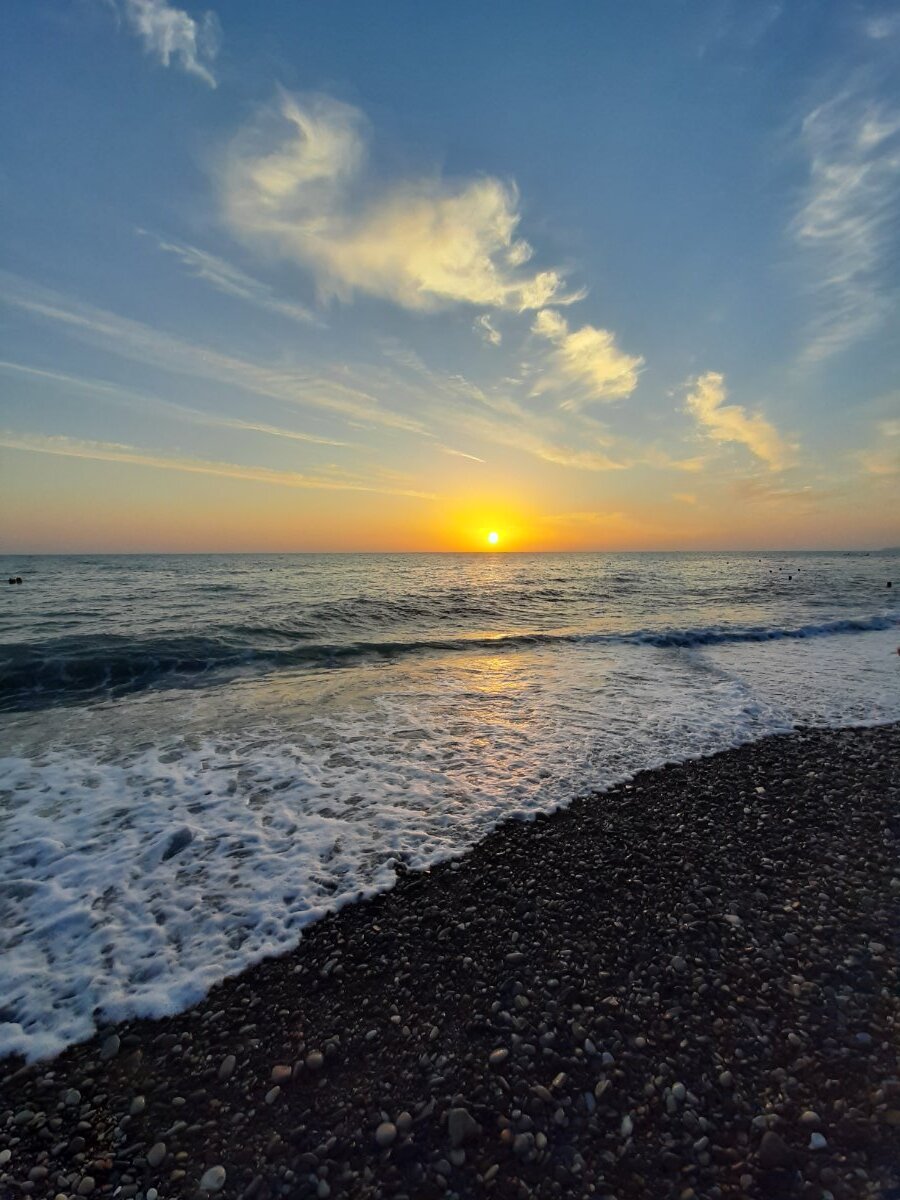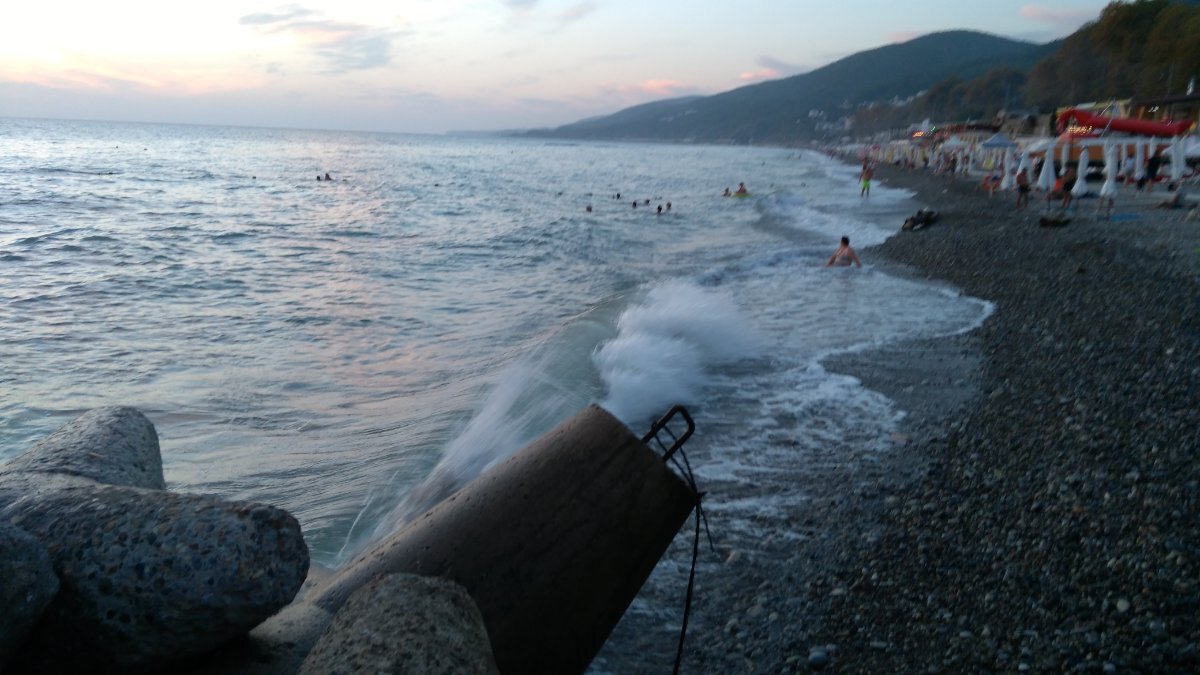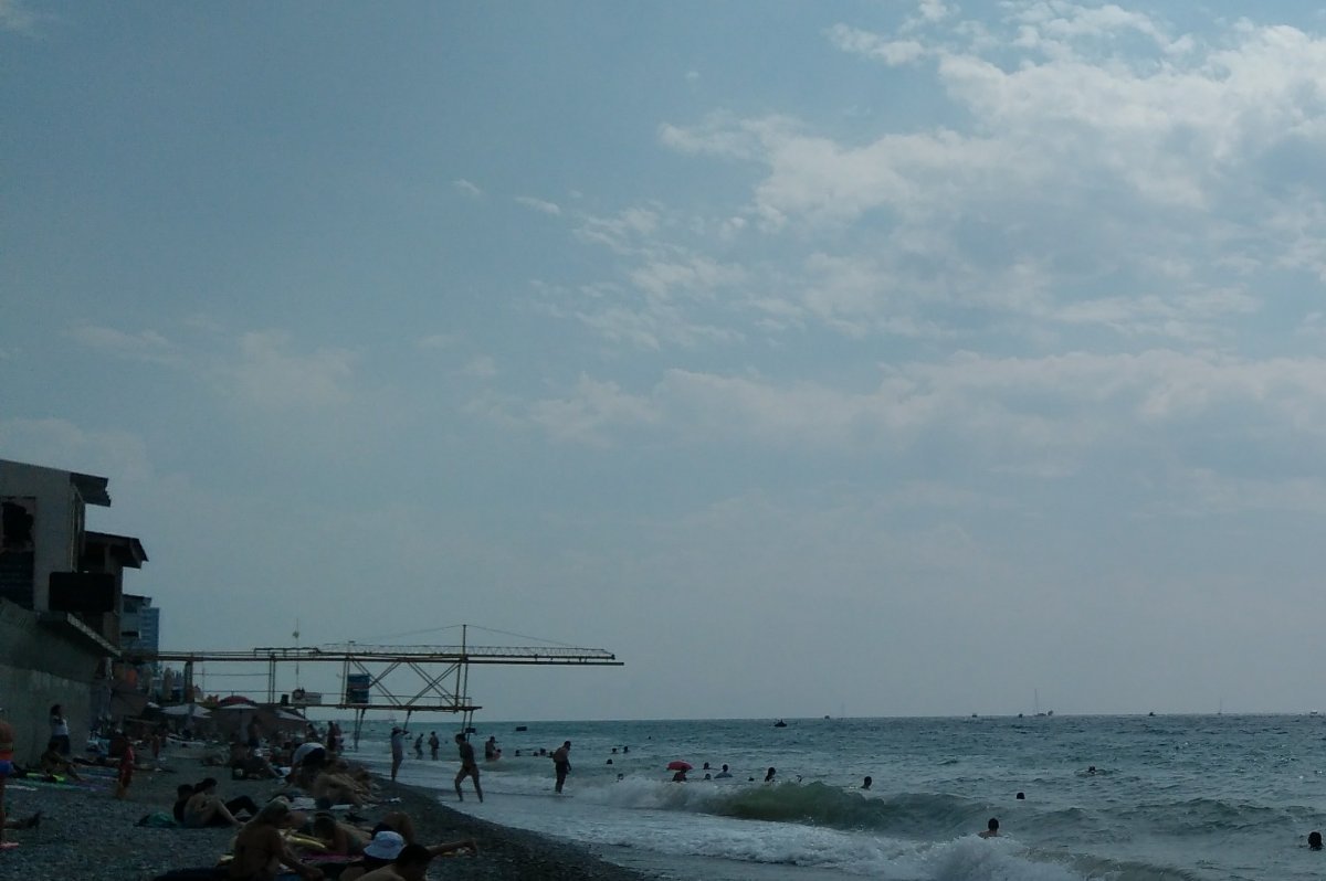 Море сегодня немного мутное и волнуется. Видимо , рано утром шел дождик, пляж мокрый