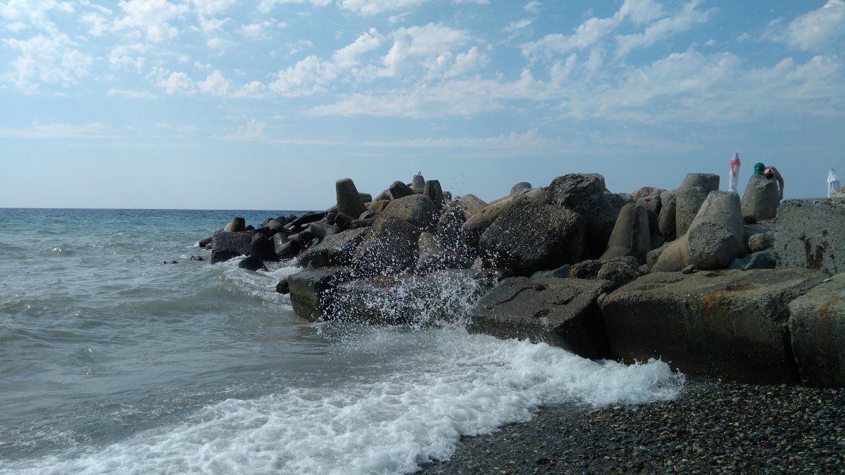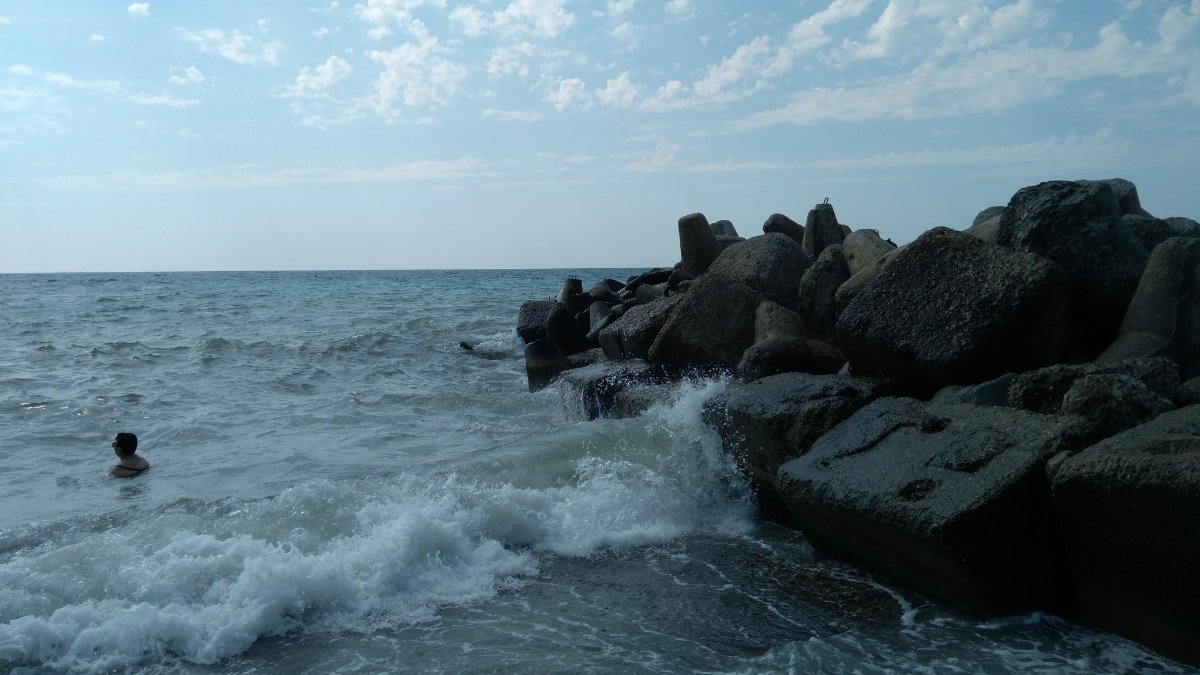 Заплыла до ближайшего буйка, обратно течение сносит, не даёт выплыть в нужном месте. Потом наконец-то прогулялась до Свирки, до камней. Волнорез тоже изменился. Раньше это напоминало хвост дракона, теперь просто бессистемное нагромождение камней и бетона. Но волны по-прежнему красиво разбиваются об эту груду.