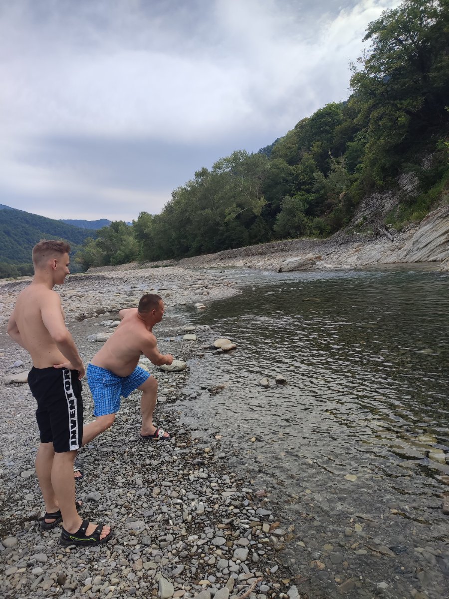 Сегодня решили не нарушать традиции и прогуляться на горную речку. Погода благоволила. Солнышко было за облачками, идти было легко и приятно. С удивлением обнаружили, что бухточки под мостом, неизменный атрибут речки вот уже лет 15, теперь нет. Скорее всего строительные работы повлияли на изменение русла. Но выше моста мы нашли не менее приятное место, пару часов там позагорали