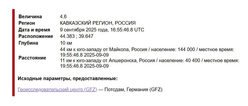 Товарищ Сухов Опубликовано 7 июля, 2024 Опубликовано 7 июля, 2024 46 минут назад, Оптимистка сказал: Землетрясение в Сочи: что известно к этому часу Сегодня в 8:09 на территории Лазаревского района немного трясло. Данные предоставлены Обнинской обсерваторией: — Магнитуда: 3.6 — Точная локация: 43°43'48''с.ш., 39°27'00''в.д. — В 27 км от Центра Сочи и в восьми километрах от Вардане — Глубина: 5 км — Точное время: 8:09:48 — Эпицентр в 27 км от центра Сочи, гипоцентр в 27,5 км от центра Сочи Ожидаем комментарий ГУ МЧС по краю. Я не МЧС, но даже и не заметил 9 2 Пишите свои сообщения в соответствующих темах форума!