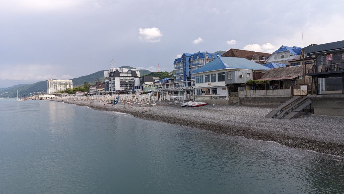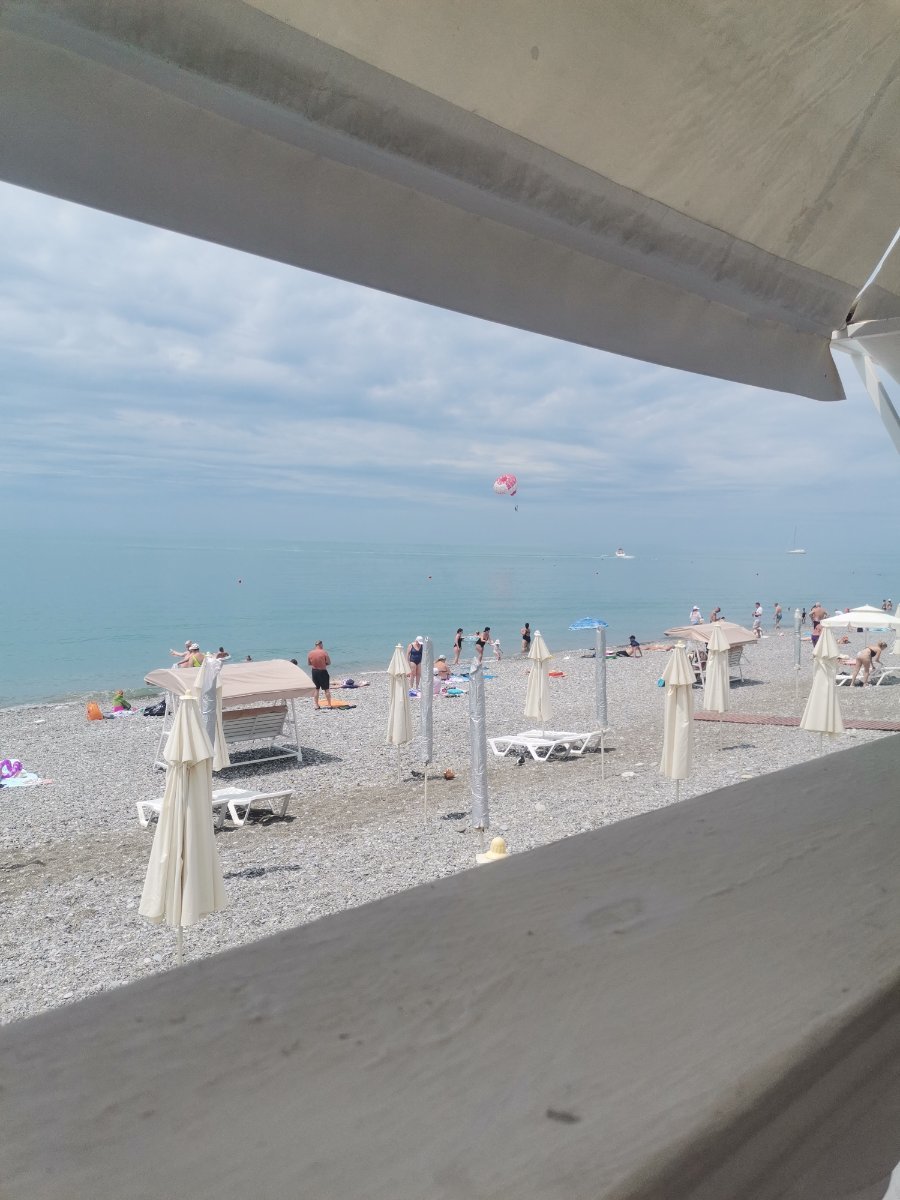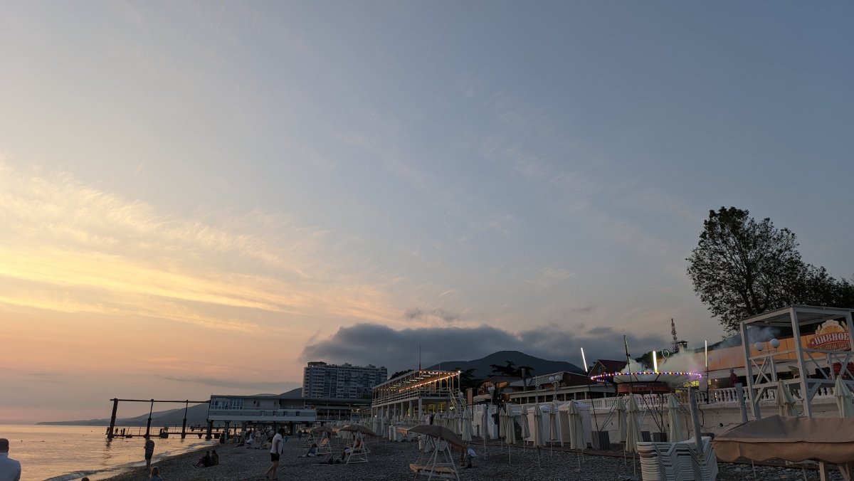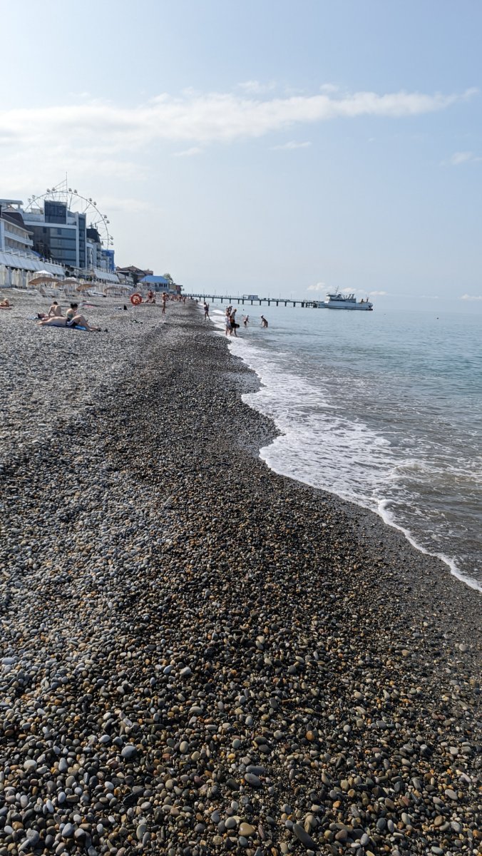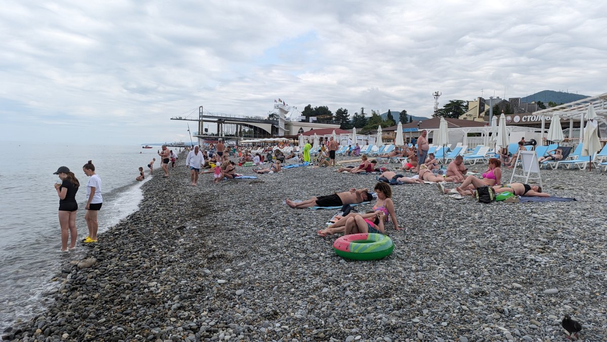 Сегодня опять облачно. Погода для нас комфортная, не холодно и не жарко. На улицах прибавилось отдыхающих. На дорогах - машин. А вот на пляжах - красота, "упасть" можно где хочешь, но лучше, конечно, рядом с @Nadik:ag:. Развлекухи ещё не работают практически, ни тебе парашютов, ни тебе бананов. Плыви хоть в Турцию))). Правда, температура воды это вряд ли позволит (((. Поэтому гуляем по Лазаревскому.