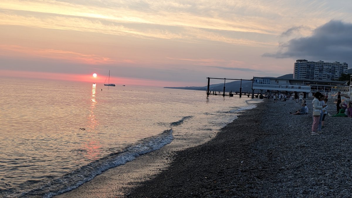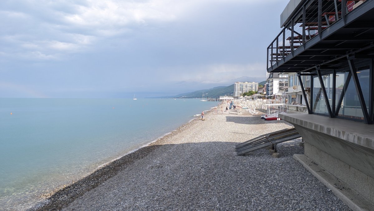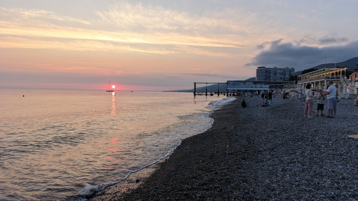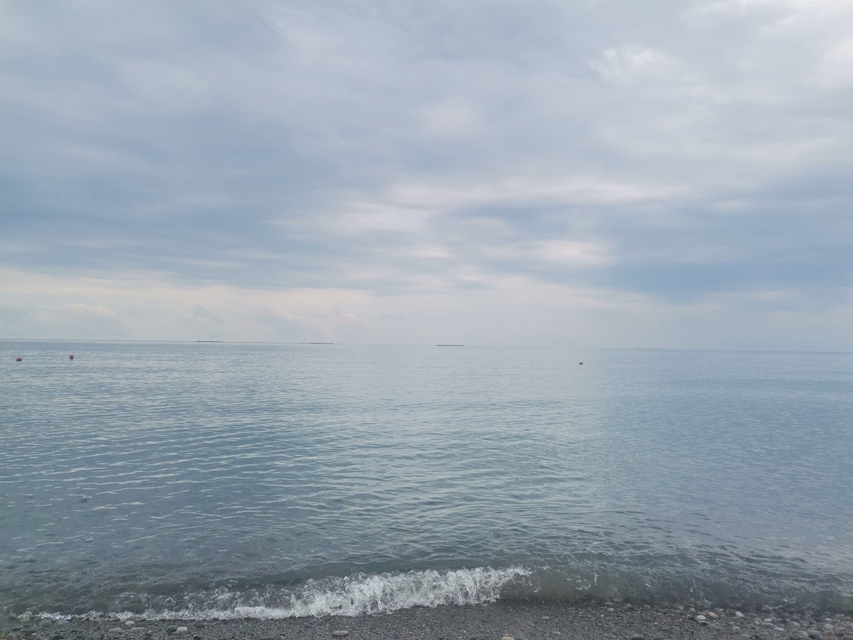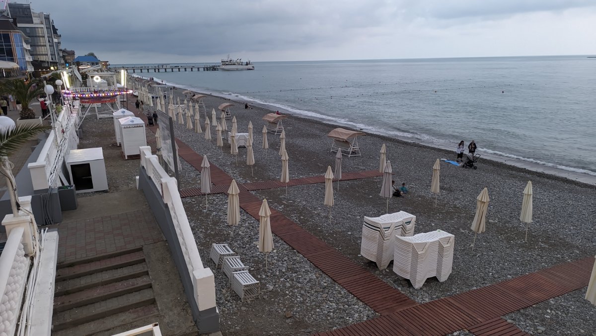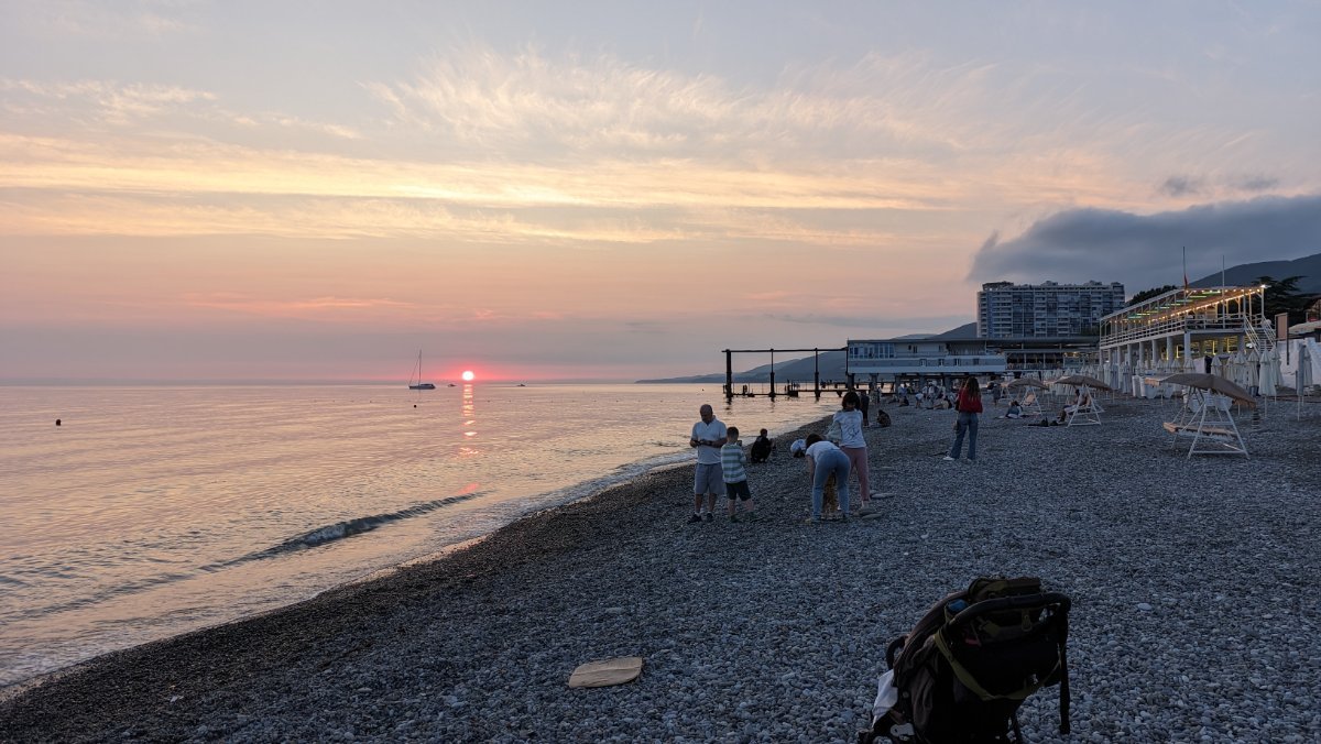 Сегодня опять облачно. Погода для нас комфортная, не холодно и не жарко. На улицах прибавилось отдыхающих. На дорогах - машин. А вот на пляжах - красота, "упасть" можно где хочешь, но лучше, конечно, рядом с @Nadik:ag:. Развлекухи ещё не работают практически, ни тебе парашютов, ни тебе бананов. Плыви хоть в Турцию))). Правда, температура воды это вряд ли позволит (((. Поэтому гуляем по Лазаревскому.
