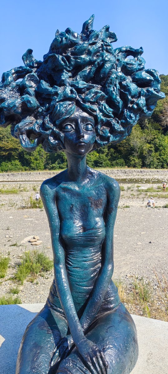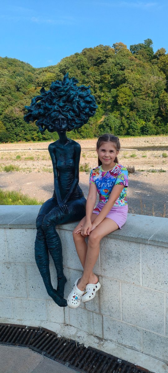 Ну и после также прогулялись по набережной реки до подвесного моста. Встретили конечно девушку Горгону. Какая же она печальная на мой взгляд.