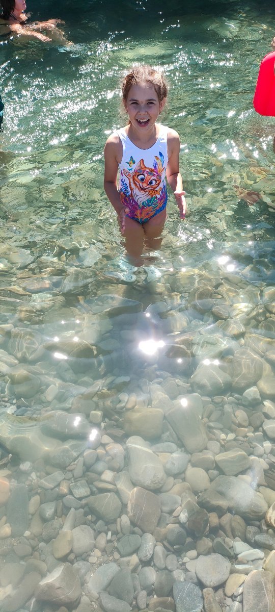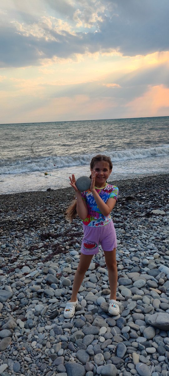 Сегодня море заметно теплее, в прошлые дни дети мои через какое-то время прямо зубами стучали, а сегодня вообще не вылазили, еле заставила уйти с пляжа, только с обещанием вечернего купания. Доча младшая научилась плавать у нас, теперь только и шныряет туда-сюда то под водой, то над водой