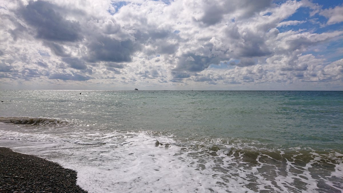 Сегодня утром было пасмурно, но мы пошли к морю и, когда я заплыла, выглянуло солнышко.