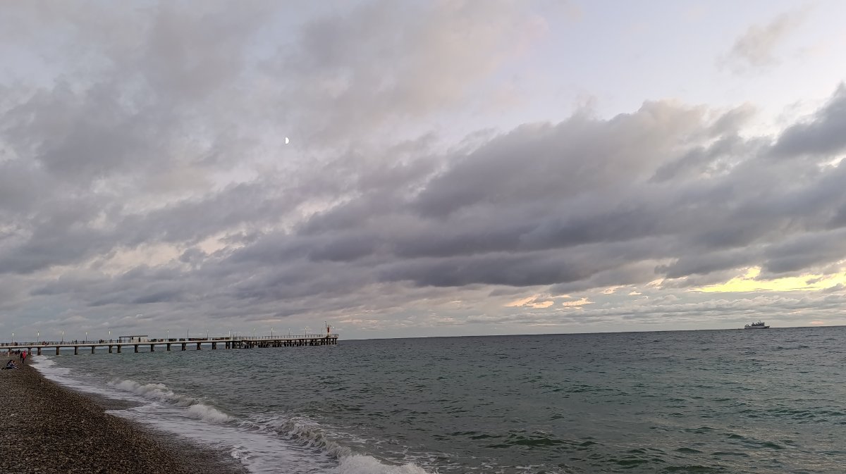 Мы сегодня поздно позавтракали и пошли на море, сидели на солнышке, грелись, ветер холодный, как то не захотелось заходить в море, решили пройтись, прогуляться по берегу, дошли до пляжа Морская звезда, вышли напротив ТЦ Бирюза и на автобусе доехали до парка, немного в парке посидели и в 4 часа пришли в номер. Муж ходил снимать закат, говорит ветер холодный и сильный.