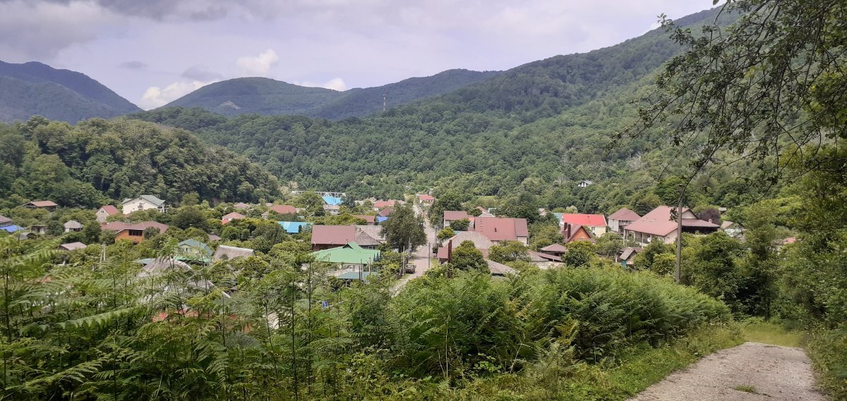 Мы сначала прошли поворот на завал, поднялись немного вверх, сфоткали аул с высоты.