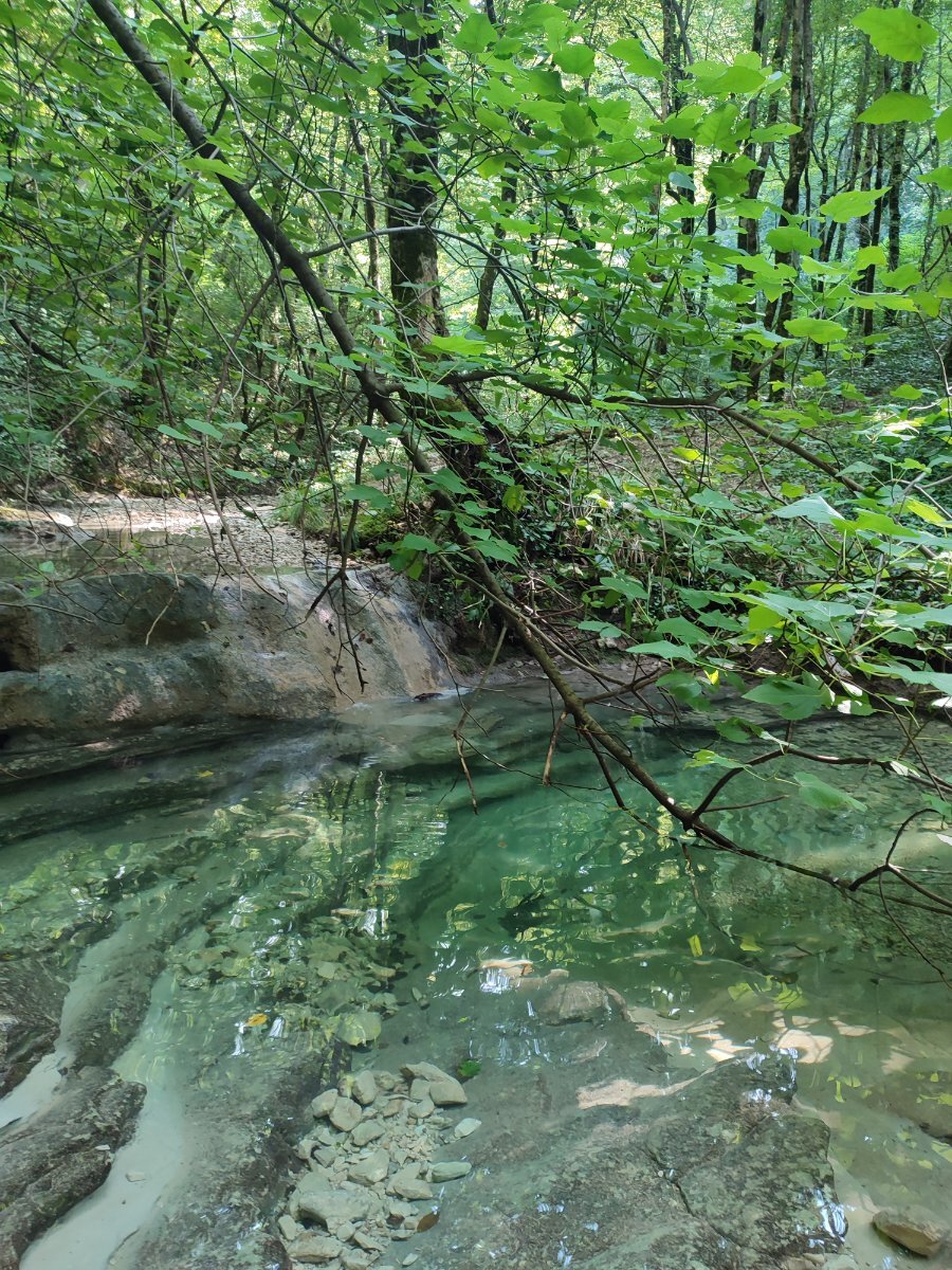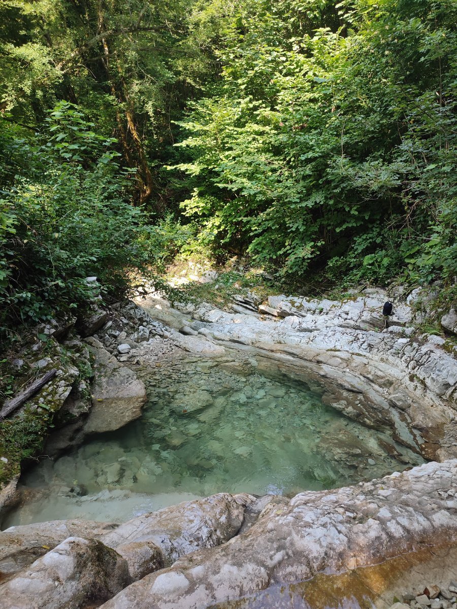 А вообще мы пошли сложным путем, до Хвойной. Там оочень крутой и достаточно долгий подъем. Зашли в лес, и долго спускались вниз, до прекрасных водопадов. Можно поступить проще, доехать до санатория Одиссея, если спиной к морю стоять, то с левой стороны санатория- улочка. Вот по ней пройти, и сразу попадаете в лес. Там прям площадка для отдыха есть, лавочки, столики. И каскадные водопады с купелью. А если пройти вглубь- то там тем более есть что посмотреть