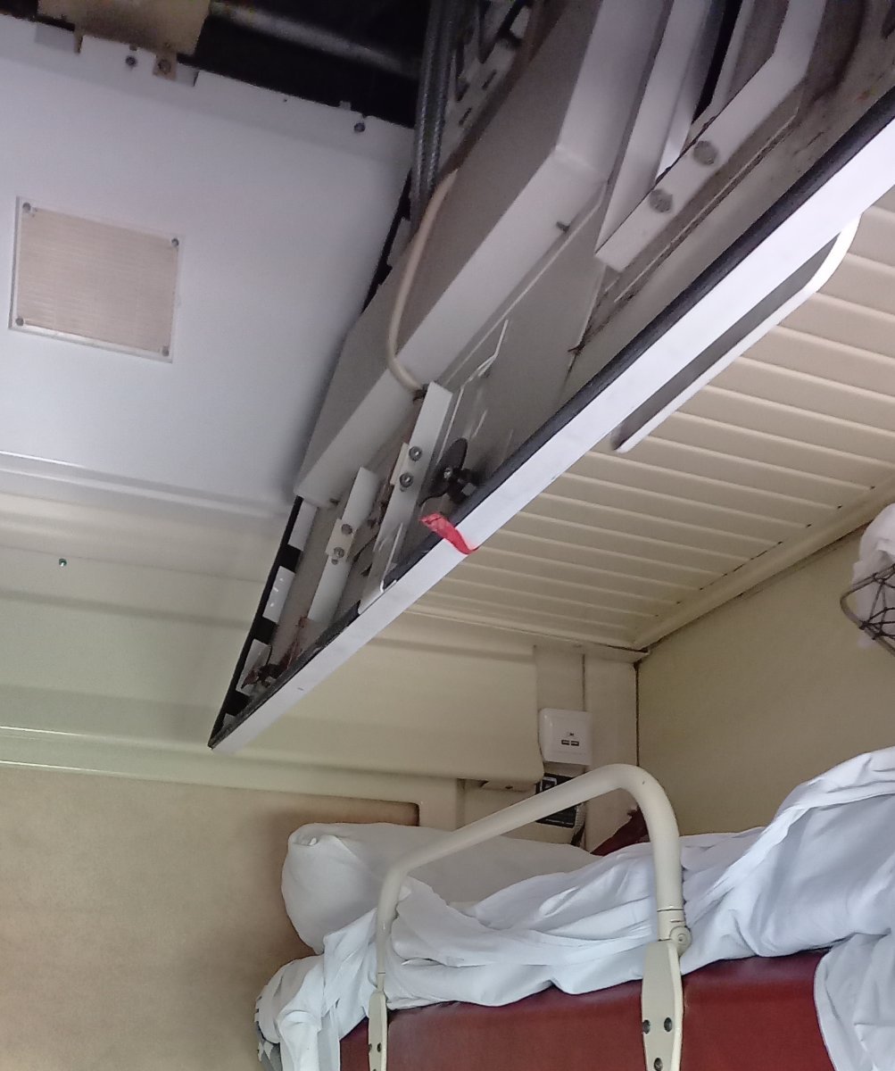 На каждой станции пытались починить этот кондиционер. Безуспешно. Пришёл то ли электрик, то ли ещё кто, и открыл крышку кондиционера. Она почти касалась верхней полки, из-за чего мужу забраться на неё без нашей помощи было невозможно - мы её поднимали и поддерживали :crazy:. Так она и провисела всю ночь и следующий день. При этом нам обещали, что кондиционер вот-вот заработает, надо только окна закрыть, чтобы было заметно ))) По итогу из-под крыши слабенько тянуло воздухом, мне кажется, уличным, абсолютно не охлажденным.