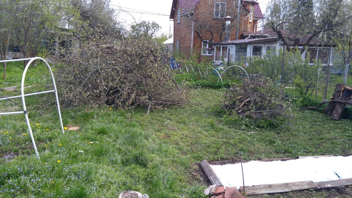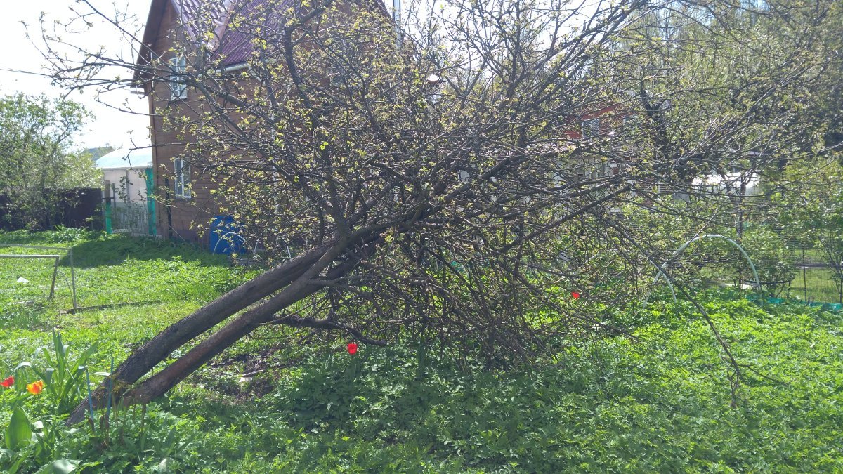 И вот сегодня потеплело, тыквы (рассада) на окошке заколосились (бутоны выбросили), пришла пора. Боялась, что будет плохо после непогоды. На деле оказалось ещё хуже, чем представлялось. Если б не соседи, вообще бы села на крылечко и заплакала. Но пришёл сосед с бензопилой, и жизнь начала налаживаться. Мы лишились: одной довольно молодой яблони (Мельба), половины старой антоновки, трёх облепих. И это не считая мелких потерь.