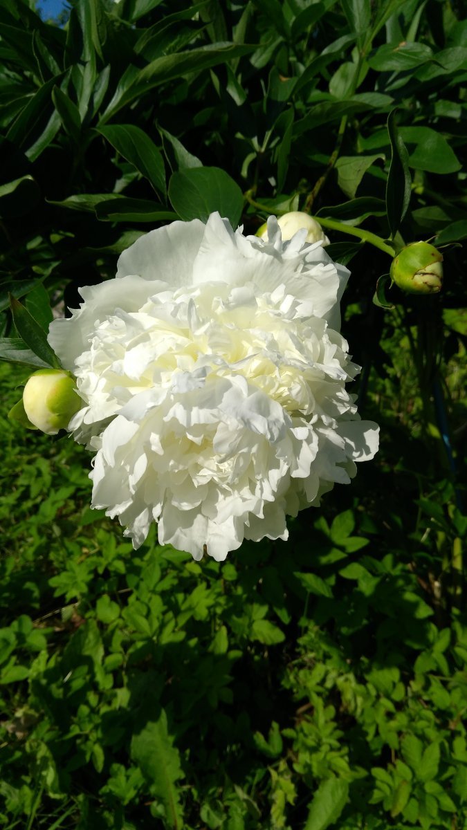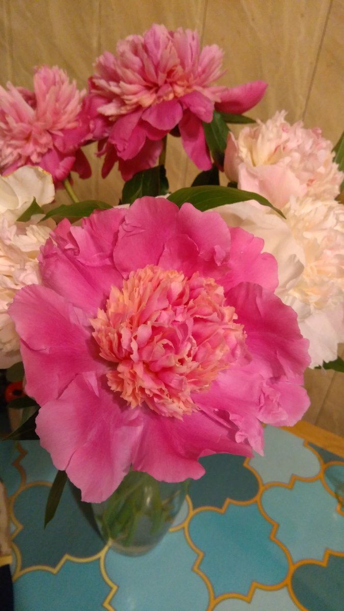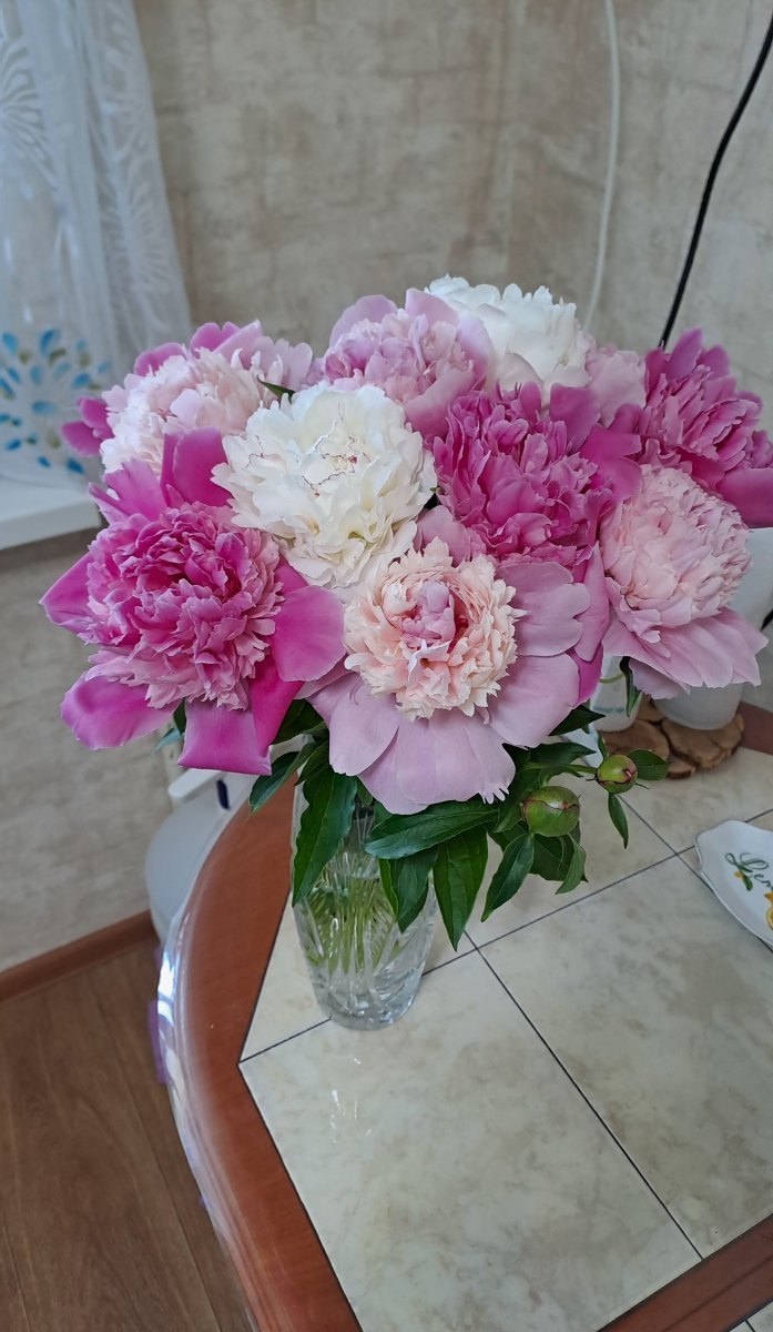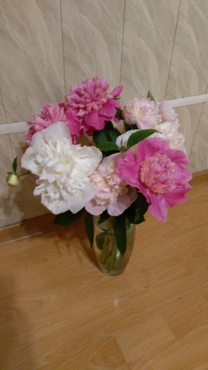 Вчера в огороде срезала пионы в бутонах. Вечером всё уже распустились