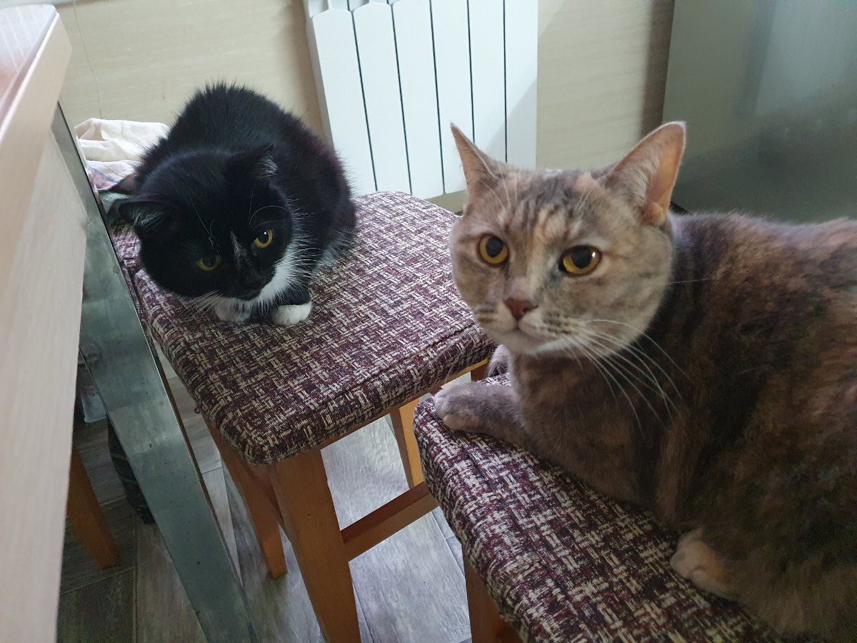 ilis Опубликовано 18 апреля, 2024 Опубликовано 18 апреля, 2024 (изменено) А это мои девочки. Черно-белая старшая, мамино наследство. Не стали ее бросать одну в частном доме после маминой смерти. Ей скоро 11 лет, приблудная дворняжка: ее мамка привела откуда-то котенком маме в огород, а сама потом исчезла. Мама звала ее Мурлышкой, мы трансформировали имя в Мурусю. А бежевая наша Кася, 3.5 года, брала с рук как шотландку: вроде похожа, хотя, наверно, помесь. Но по характеру шотландка классическая, как породу описывают )). Не слишком удачное фото, но сфотографировать сразу двух проблематично: не воюют, но и совсем уже рядом находиться не любят, держат некоторую дистанцию. Тарелки, еда, горшок - общие. Также общие любимые места дислокации, отдыхают там по очереди. Изменено 18 апреля, 2024 пользователем ilis 15 2