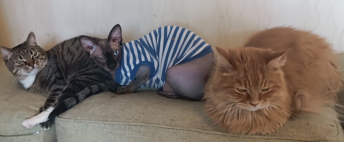 Zoltana Опубликовано 18 апреля, 2024 Опубликовано 18 апреля, 2024 Моя котячья троица. )) Сначала появился Вася (крайний слева), подобрали новорожденным у подъезда, еще с пуповиной был, выкормили из пипетки. Потом дочка поехала отдыхать в деревню и там нашла худющего, голодного, рыжего котенка....ну....привезла , в общем.))) Шебутной, как на батарейках. Назвали Ёршиком, со временем стал просто Ёш. )) А потом я решила исполнить свою многолетнюю мечту. Лет 20 мечтала о сфинксе, но всегда какое-то животное уже было в доме, не решалась. А тут, думаю, если не сейчас, то никогда уже не заведу. Двое, трое ...уже без разницы ....Так появился у нас Гоша.)) 12 4